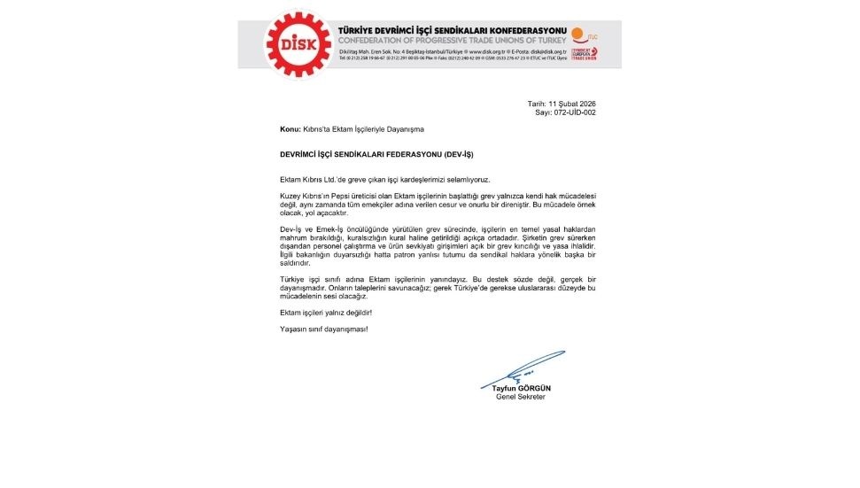 Federasyon tarafından yapılan yazılı açıklamada, Kuzey Kıbrıs’ın Pepsi üreticisi olan Ektam işçilerinin başlattığı grevin yalnızca kendi hak mücadelesi olmadığı, tüm emekçiler adına verilen bir direniş olduğu ifade edildi.